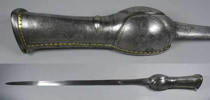Пата - оружие, изобретенное в Индии. Изначально его использовала древняя каста воинов-маратхов, а позже это оружие распространилось по большей части Индии. В сущности, это был меч, присоединяемый к латной перчатке, но в отличие от обычной перчатки, подобное оружие защищало руку до локтя. Поскольку вся конструкция от кончика меча до локтя была цельной, воины маратхи были не в состоянии двигать своим запястьем, поэтому все движение должно было исходить от локтя. Считается, что подобное оружие чаще использовали всадники.