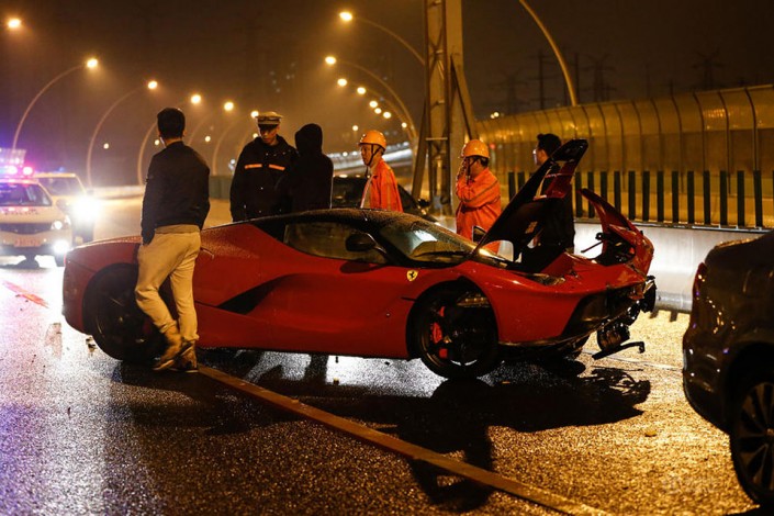 Супергибрид под управлением некого юного пилота разбился в Шанхае - предположительно, из-за сочетания мокрой дороги, высокой скорости и - чего уж там - неопытности водителя. Сам паренек, к счастью, не пострадал.