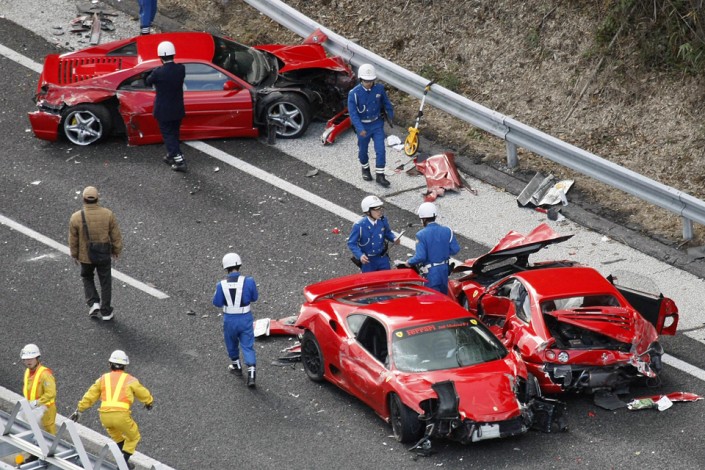 Суперкары - тоже машины, и ничто автомобильное, вроде обыкновенной дорожной аварии, им не чуждо. Но в случаи, вроде этого, верится с трудом - в 2011-м на мокрой дороге в Японии столкнулось аж 14 машин, девять из которых - суперкары. Во всяком случае, были ими.