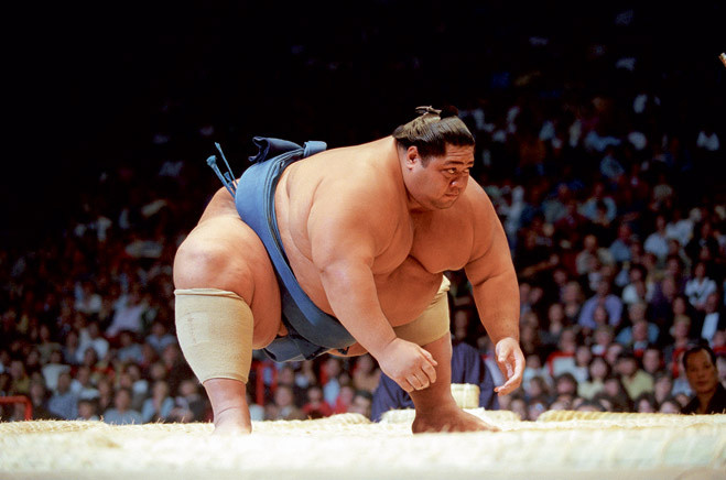 3. Сумо - очень травмоопасный вид спорта. Стартовый контакт - это столкновение двух в среднем 155-килограммовых борцов с совокупной скоростью 50-60 километров в час. По травмам на первом месте идут колени, затем локти, спина и шея, голеностопы и пальцы.