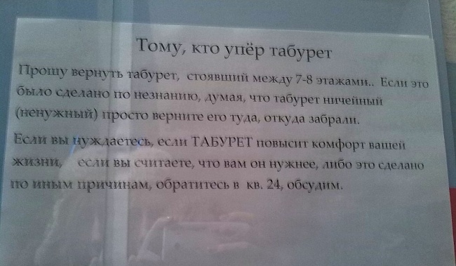 В каждом доме, дворе или подъезде обязательно найдутся люди, которые делают жизнь окружающих людей пусть немного, но веселее. Они не заканчивали художественных академий, но это не мешает им творить, писать шедевральные объявления, разрисовывать стены и бороться за справедливость. В этом материале AdMe.ru выбрал лучшее из того, что было придумано самыми обычными людьми в апреле. Наслаждайтесь и умиляйтесь.