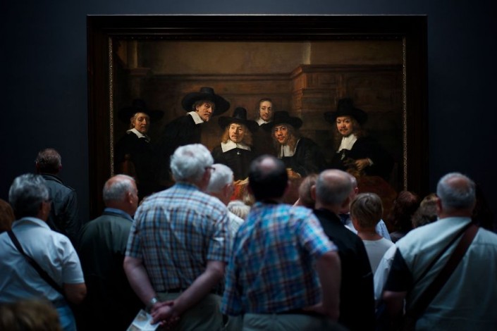 Посетители музея рассматривают картину "Синдики" кисти Рембрандта, которая хранится в амстердамском музее Рейксмюзеум.