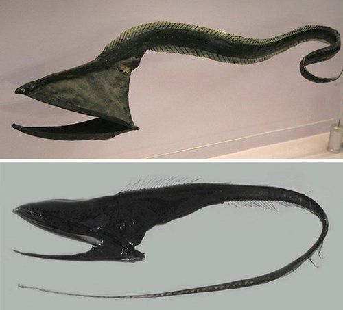 Угорь с головой пеликана. Встретить это существо можно на глубине около одной тысячи метров, длина его туловища достигает двух метров. Большерот - вероятно, одно из самых странно выглядящих глубоководных созданий, скрывающихся в глубинах океана. С огромным ртом, пеликан способен к глотанию вещей, намного больших, чем его собственный размер.