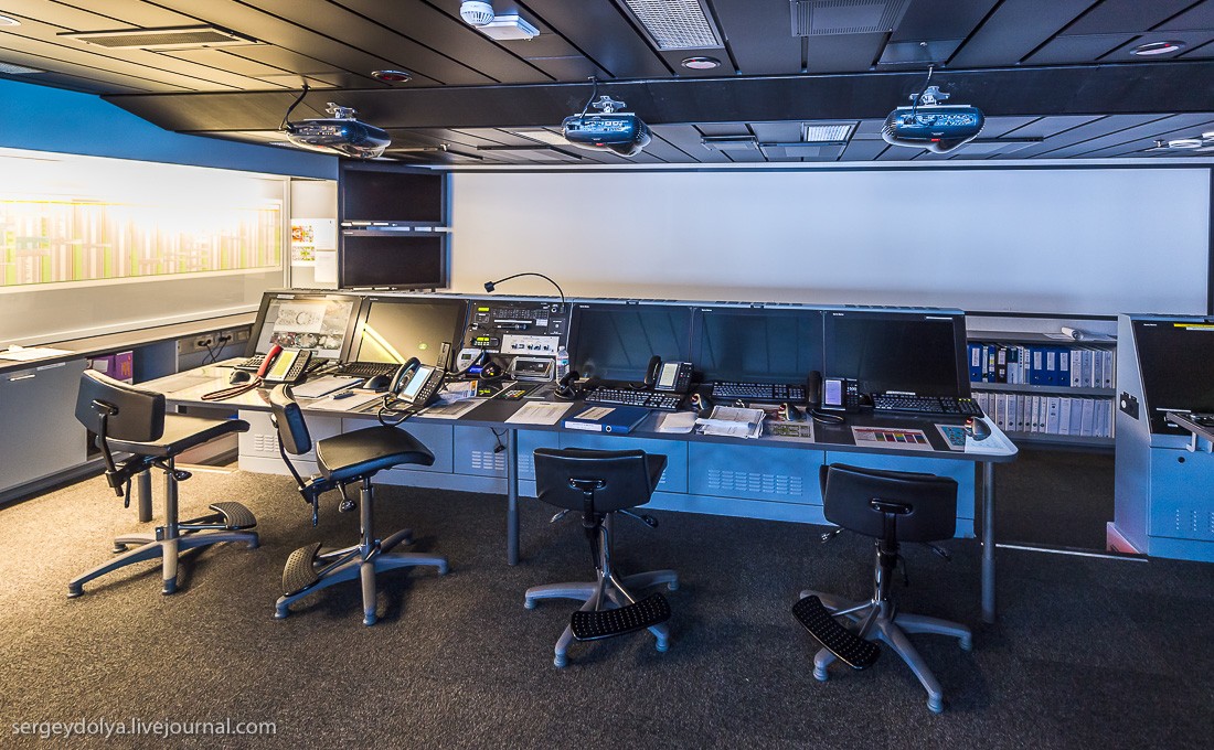 На капитанский мостик нет экскурсии, но мне повезло плыть вместе с группой испанских журналистов. Их визит был согласован, и мне удалось примазаться к этой компании. Капитанский мостик выглядит пустовато. Огромная площадь, но органы управления занимают лишь небольшой участок по центру. Кораблем управляет не капитан, а первый офицер. Он нам и проводил экскурсию. Офицера зовут Геннадий. Он из Одессы. Наш хлопчик.