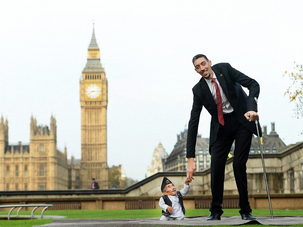 Самый низкий и самый высокий человек в мире встретились в Лондоне по случаю проведения фотосессии для Книги рекордов Гиннесса. Фотография Султана Кесена - самого высокого человека в мире рядом с Чандрой Бахадуром Данги - самым низким человеком в мире выглядит очень трогательно.