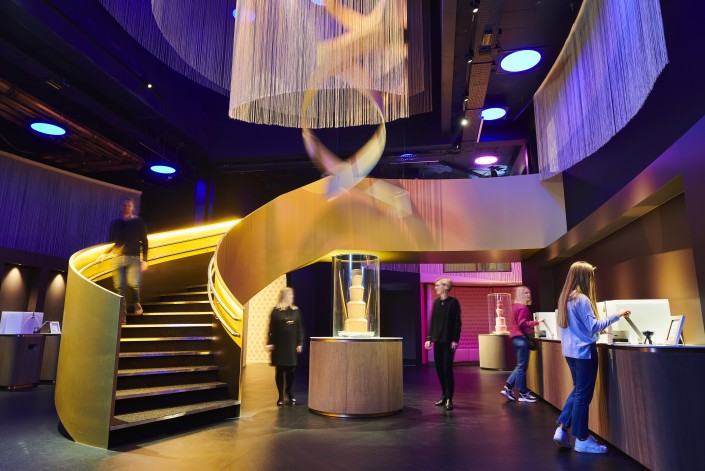 Во-вторых, музей очень интересно оснащен современными информационными технологиями. Здесь делятся с посетителями информацией не так, как мы привыкли. Гости проходят через музей маленькими группами, чтобы все могли все увидеть и услышать. В каждом зале индивидуальная демонстрация - клип на экране на полу про "добычу" шоколада, индустриальный спектакль про его производство, мини-мастер-класс по производству шоколада пралине и так далее. На время презентации двери зала автоматически закрываются. Нельзя не дослушать историю и уйти раньше или остаться и продолжать пробовать шоколадные шарики разных оттенков. Датчики аккуратно отлеживают время начала презентации в каждом зале и сообщают вам, сколько вам еще ждать, прежде чем вы сможете войти в следующий зал. История шоколада рассказывается через аудиогид. Это самый удобный автоматический гид, который я когда-либо видела. Хотя сначала я ленилась держать его все время у уха, а потом догадалась подключить к нему свой наушник от iPhone.
