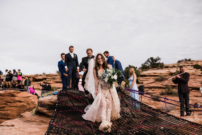 Свадебная церемония влюбленных из США прошла на высоте 122 метра. Молодые связали себя узами брака на растянутой сетке над каньоном Моаб, который находится в южной части Юты и славится своим марсианским пейзажем. Фотографы Эбби и Каллен Хирнс запечатлели экстремальное бракосочетание, сделав потрясающие и захватывающие дух снимки.