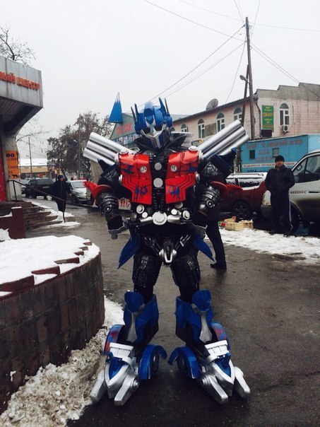 Авторы косплея неизвестны, однако на фото видно, что костюм Оптимуса Прайма сделан довольно качественно. Судя по комментариям алматинцев, снимки сделаны в районе барахолки и "Тастака".