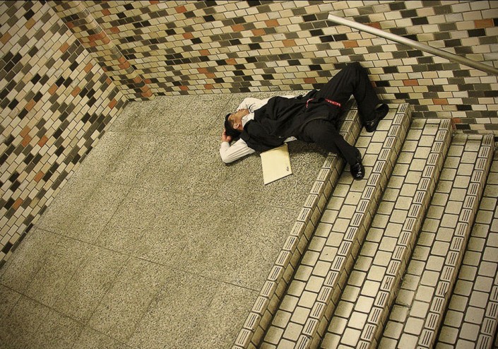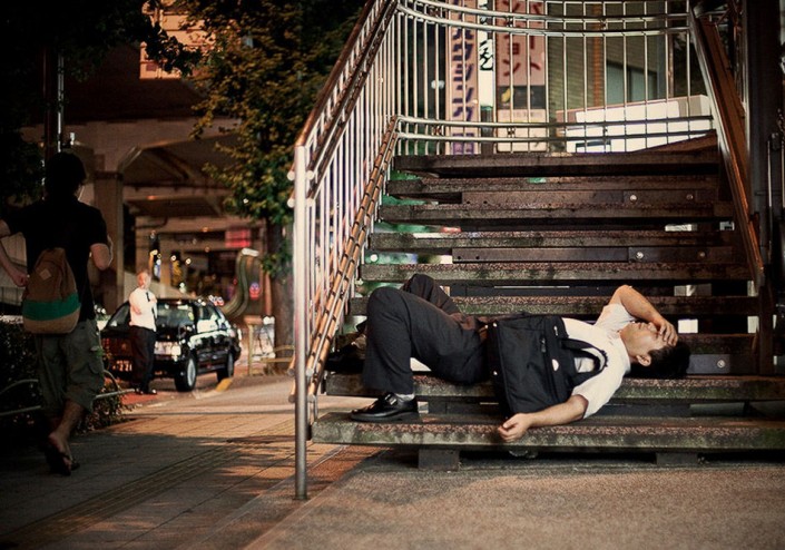 Фотограф Адриан Стори решил показать всему миру нелегкую жизнь работников в Стране восходящего солнца и создал серию фотографий, на которых запечатлел несчастных японцев, измотанных бесконечной работой и побежденных сном в вовсе не предназначенных для этого местах.