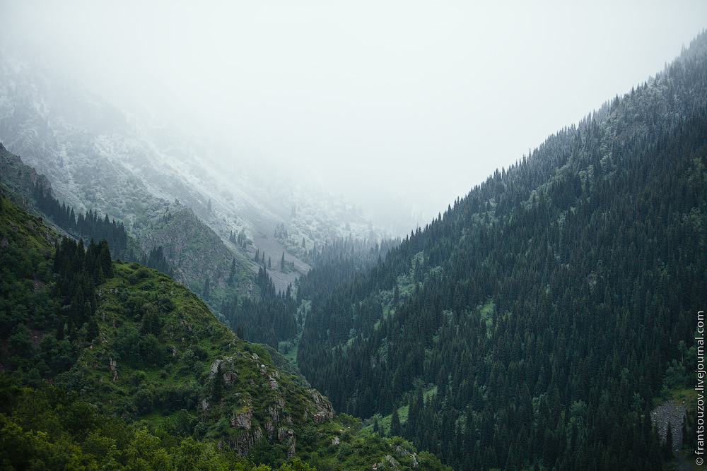 "Горное озеро на высоте 2000 метров, чистейшая вода нереального бирюзового цвета и мертвый лес, стоящий среди нее, - когда-то здесь росли деревья. Вдалеке плавает утка и орет на всю округу, а эхо от ее кряканья разносится в горах... Это утро просто взорвало мой мозг", - пишет Французов после посещения озера Каинды.