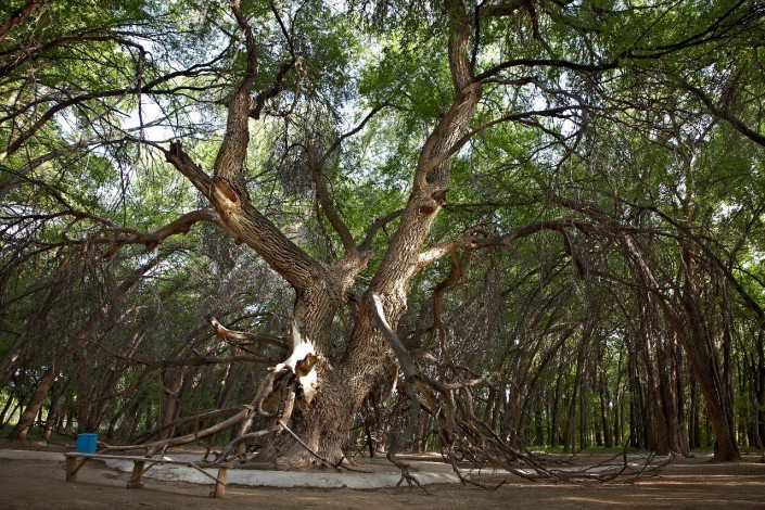 700-летний карагач недалеко от Жаркента в Алматинской области. Поскольку дерево считается священным, любой желающий может загадать желание, прижавшись к могучему стволу и привязав платочек к опустившимся под тяжестью времени ветвям. Размер платочков прямо пропорционален масштабам желания: ветви украшены ленточками, платками и порой даже простыней.