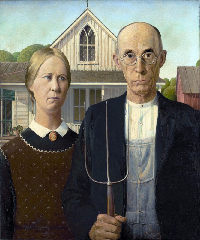 Работа Гранта Вуда считается одной из самых странных и угнетающих в истории американской живописи. Картина с мрачными отцом и дочерью переполнена деталями, которые указывают на суровость, пуританство и ретроградство изображенных людей.