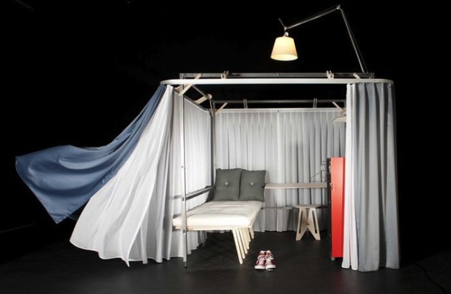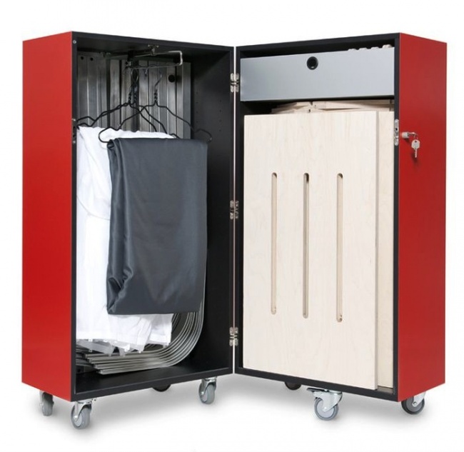 Дизайнеры Роберто Де Лука и Антонио Скарпони придумали красный чемодан на колесах, который превращается в четыре квадратных метра "личного пространства" и включает в себя кровать, стол, стул, шкаф, лампу и ширму!