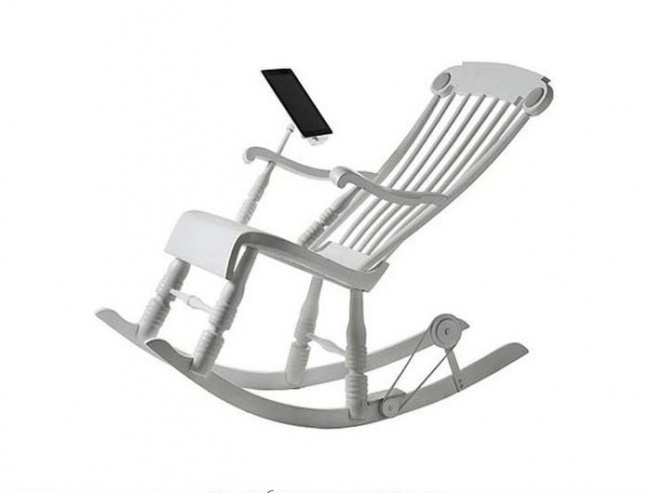 Швейцарская компания Micasa Lab разработала экологически чистый способ зарядки айфонов - за счет качания на кресле-качалке вырабатывается энергия, которая заряжает телефон и динамики, встроенные в спинку кресла. Для зарядки айпада необходимо качаться почти три часа.