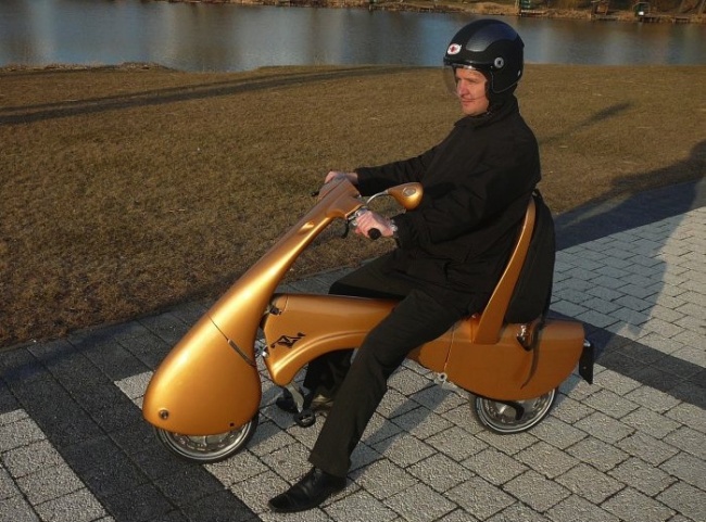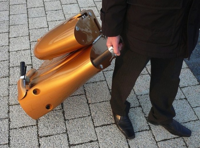 Электроскутер легким движением руки превращается в чемодан весом в 25 килограммов. Максимальная скорость мопеда достигает 45 километров в час.