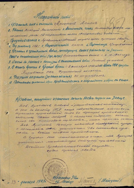 "Товарищ Арестеев - смелый и решительный командир. В бою за высоту 177,9 наше подразделение атаковало траншею противника. Когда до нее осталось 200 метров, с немецкой стороны начали бить два станковых пулемета, наша пехота залегла. Лейтенант Арестеев быстро поставил требуемый прицел и с нескольких мин уничтожил два станковых пулемета и восемь солдат противника. В другом бою минометным огнем товарищ Арестеев уничтожил минометную батарею противника", - кратко описан его подвиг в наградном листе, за который ему вручили орден Красной звезды.