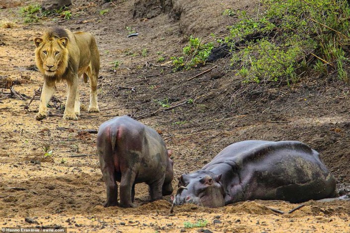 Фотограф Ханно Эразмус запечатлел душещипательный фрагмент из жизни дикой природы в национальном парке Крюгера, который находится на северо-востоке ЮАР. Самка гиппопотама застряла в грязи и, не сумев выбраться, лежала без сил в ожидании своей участи. Этим решил воспользоваться проходивший мимо голодный лев. Но ему помешал детеныш бегемота, который, защищая свою маму, начал прыгать и бегать за хищником.