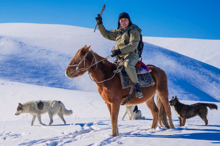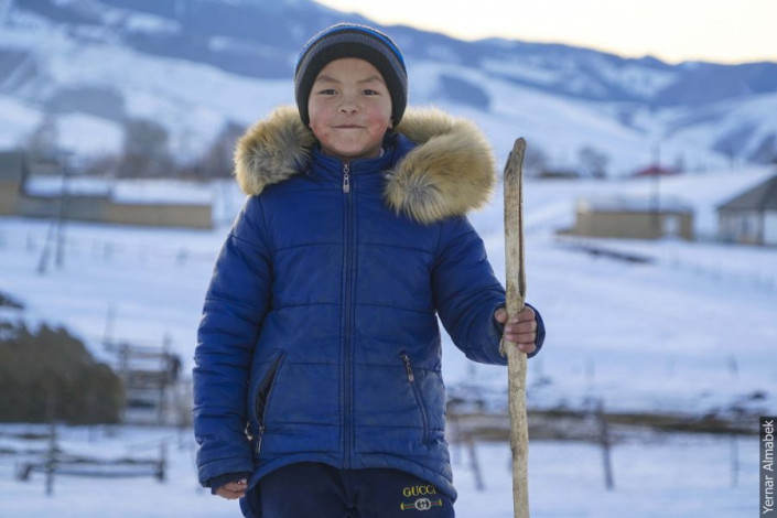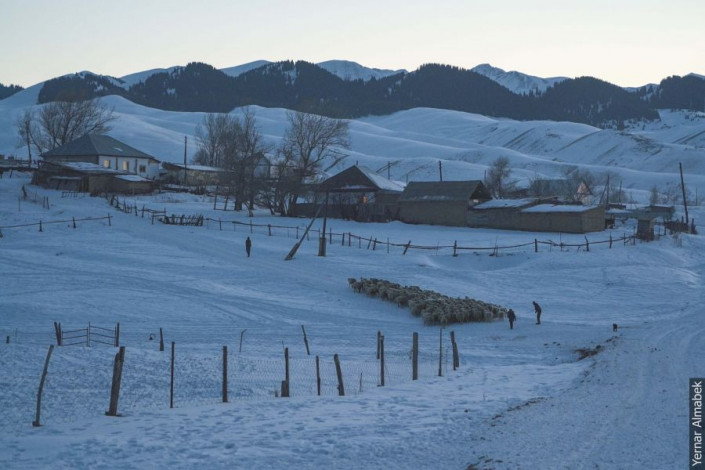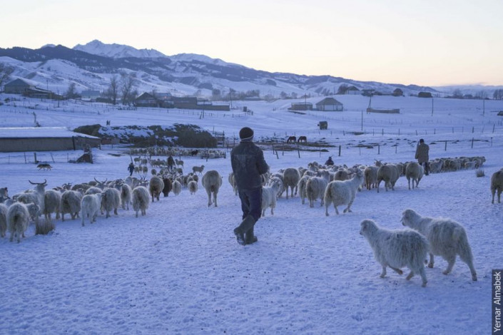 "Около восьми часов за стадом следят пастухи. От кусачего холода их спасает плотная теплая одежда и термос горячего чая. К заходу солнца они уже пригоняют скот домой, потому что важно успеть подсчитать его количество дотемна", - рассказывает Ернар Алмабек.