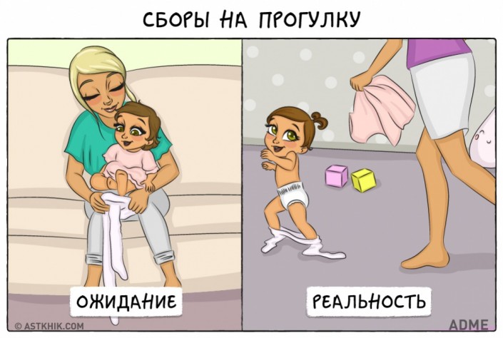 Представления о том, как будет есть или спать ребенок, могут сильно отличаться от реальности. После рождения малыша родители делают много неожиданных открытий о себе, ребенке и новой совместной жизни. Посмотрим на иллюстрации о ярких моментах из жизни семейной пары, у которой появился малыш.