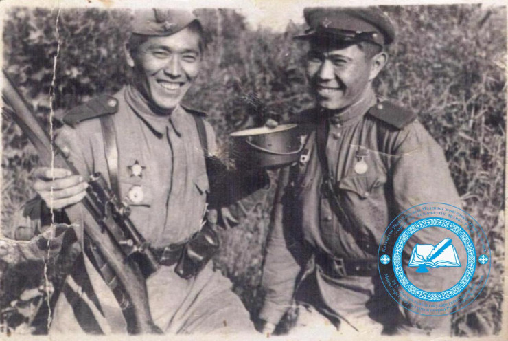 Фронтовые снимки, отображающие солдат в часы отдыха, как правило, часто являются постановочными. Но глядя на этот снимок, создается ощущение, что проходивший мимо фотограф совершенно случайно зафиксировал радостный момент счастливой встречи двух друзей, фронтовых товарищей, гвардейцев-панфиловцев - знаменитого снайпера Тулеугали Абдыбекова (в архивных документах указан как Тлеугалий. - Прим.ред) и рядового 1075-го полка, знаменитого тенора и художественного руководителя ансамбля красноармейской самодеятельности дивизии Темирбека Кокубаева (справа).