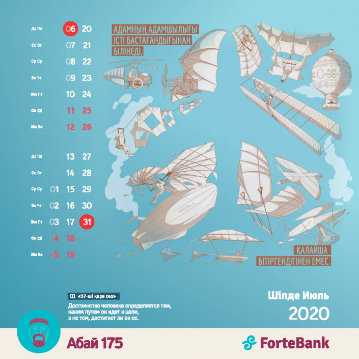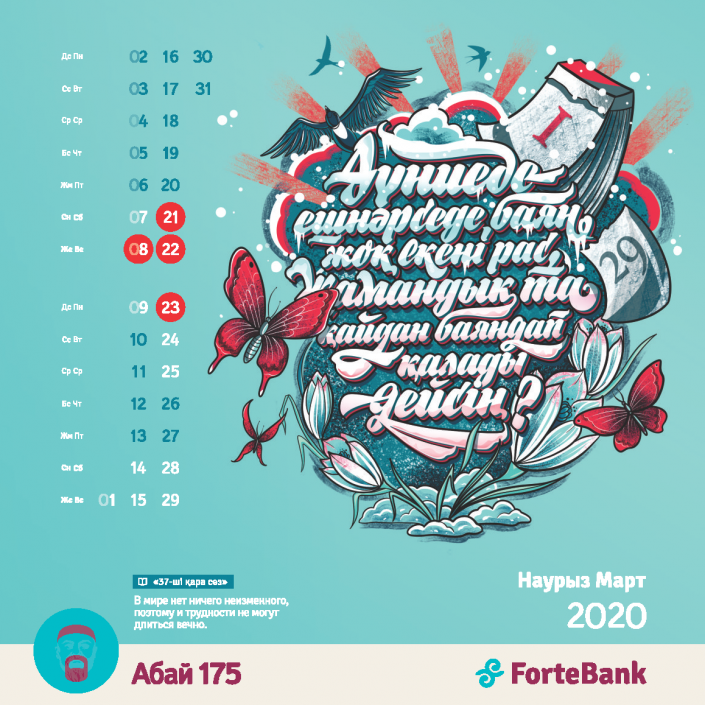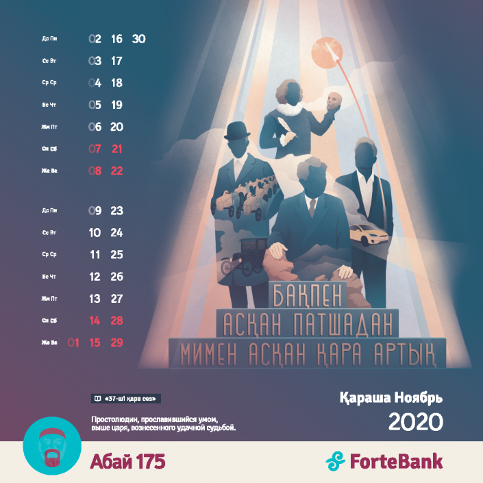 В преддверии нового года ForteBank представил уникальный корпоративный календарь на 2020 год. В нем иллюстраторы из нескольких стран мира попробовали переосмыслить наследие великого казахского поэта Абая Кунанбаева. Материалом для эксперимента стало одно из самых известных и цитируемых произведений Абая - "Қара сөз" - сборник из 45 слов-назиданий.
