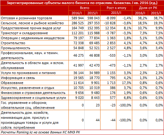 По состоянию на первый квартал 2016 года, количество зарегистрированных субъектов малого предпринимательства в стране составило более 1,5 миллиона. Из них активными являлись 1,3 миллиона предприятий. Сообщается, что индивидуальные предприниматели в Казахстане являются самыми активными участниками бизнес-среды. В первом квартале 2016 доля индивидуальных предпринимателей от общего числа субъектов малого бизнеса составила 68,2 процента. На юридические лица приходится 19,6 процента, крестьянские (фермерские) хозяйства насчитывают 12,2 процента.