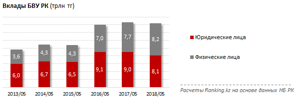Между тем к маю 2018 года вклады физлиц составили 8,2 триллиона тенге и впервые превзошли вклады юридических лиц.