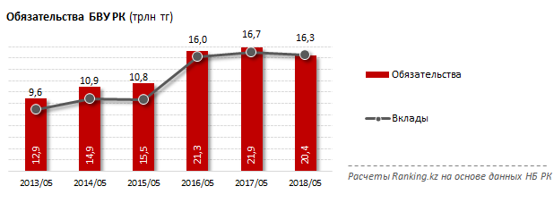 Помимо активов, банки снизили свои обязательства. К примеру, по итогам мая объем обязательств перед вкладчиками составил 20,4 триллиона тенге, хотя год назад эта сумма равнялась почти 22 миллиарда тенге.