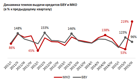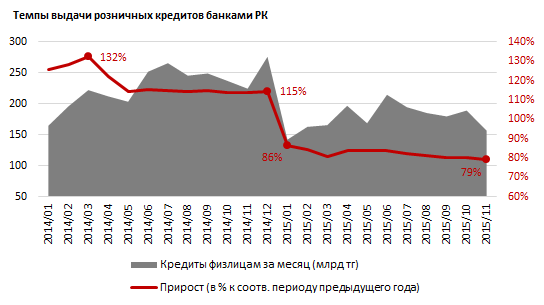 "В этих условиях инициативу по предоставлению кредитных ресурсов населению у банков перехватывают микрокредитные организации. По итогам третьего квартала 2015 года, после августовской девальвации и дальнейшего ослабления курса тенге, объем выдачи кредитов физлицам МКО резко вырос - в 2,2 раза, до 30 миллиардов тенге. В то же время объем банковского розничного кредитования сократился на 4 процента по сравнению с предыдущим кварталом", - отметили эксперты.