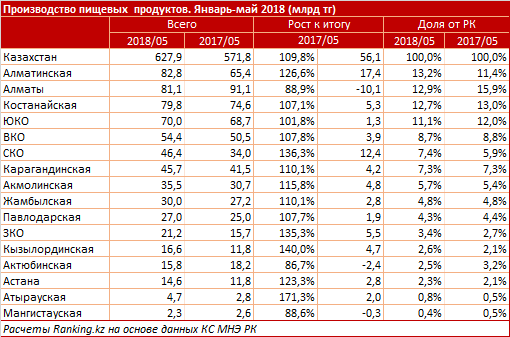 Всего в стране произвели продуктов питания на 627,9 миллиарда тенге - это на 9,8 процента больше, чем год назад. С учетом инфляции рост физического объема пищепрома составил 6,3 процента.