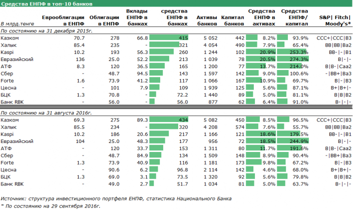 Также в таблице привлекают внимание Kaspi, Евразийский и АТФ банки, у которых финансирование от ЕНПФ занимает очень существенную долю в активах. Эксперты уверены, что у всех этих банков инвестиции ЕНПФ существенно превышают размер собственного капитала, что указывает на более высокие риски таких инвестиций с точки зрения ЕНПФ. При этом Евразийский и АТФ банки имеют более низкие кредитные рейтинги по сравнению с другими банками.