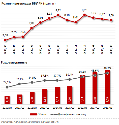 Как отмечается, при этом год-к-году розничные вклады БВУ РК все еще показывают рост: на 6,7 процента (510,2 миллиарда тенге) к марту 2017. В целом же на рынке депозитов за год зафиксирован отток на 1,1 процента (177,8 миллиарда тенге).