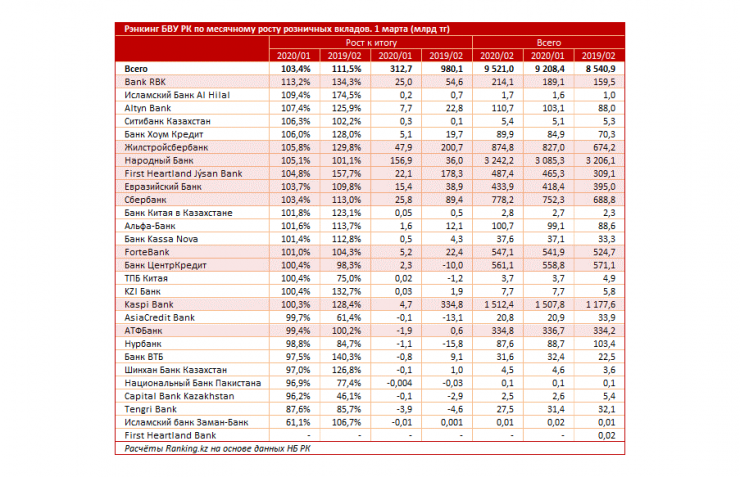 В топ-3 БВУ в рэнкинге по месячному росту розничных вкладов также вошли Исламский Банк Al Hilal (+9,4 процента, до 1,7 миллиарда тенге) и Altyn Bank (+7,4 процента, до 110,7 миллиарда тенге). В годовой динамике оба БВУ тоже в плюсе.