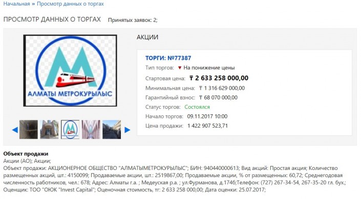 На продажу были выставлены 60,72 процента акций АО "Алматыметрокурылыс". Торги проходили голландским методом - на понижение цены. Стартовая цена: 2 миллиарда 633 миллиона 258 тысяч тенге, минимальная цена: 1 миллиард 316 миллионов 629 тысяч тенге. Аукцион начался 9 ноября в 10 утра. По итогам торгов государственное предприятие было продано за 1 миллиард 422 миллионов 907 тысяч 523 тенге 71 тиын. Информации о покупателе пока нет.