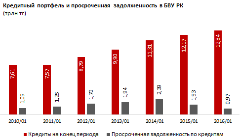Кредитный портфель казахстанских банков второго уровня показывает непрерывный рост шестой месяц подряд. На конец января он составил 12, 844 триллиона тенге, увеличившись за месяц на 1,3 процента, за год - на 5,6 процента. При этом просроченная задолженность после небольшого роста в октябре-ноябре вновь вернулась на уровень ниже 1 триллиона тенге, или 7,5 процента от портфеля.