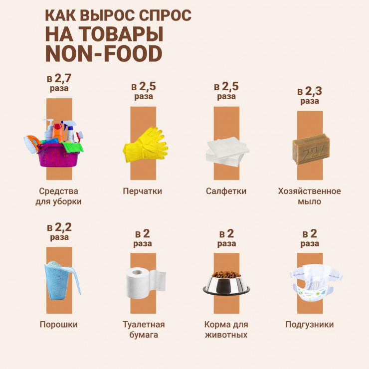 В списке самых востребованных непродовольственных товаров туалетная бумага и вовсе оказалась на 6-м месте. Гораздо большим спросом пользовались средства для уборки дома и резиновые перчатки. Кстати, в отличие от бума на туалетную бумагу, это абсолютно оправданно.
