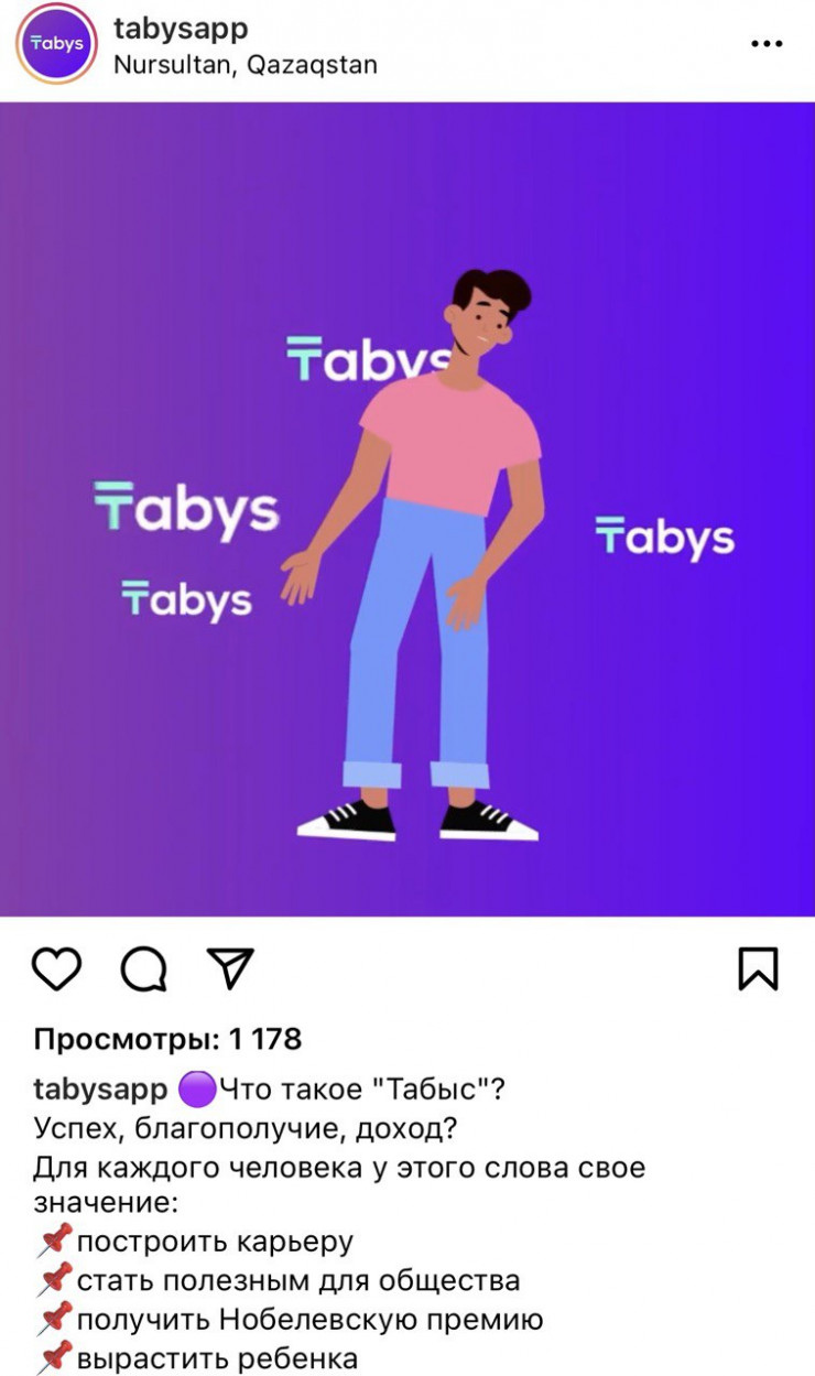 Примерно в это же время в Instagram появился аккаунт TabysApp, который рассказывает читателям про успех в нематериальном смысле. В аккаунте пишут, что TABYS для каждого разный: для кого-то это значит построить карьеру, для кого-то – стать полезным для общества, получить Нобелевскую премию или вырастить ребенка.