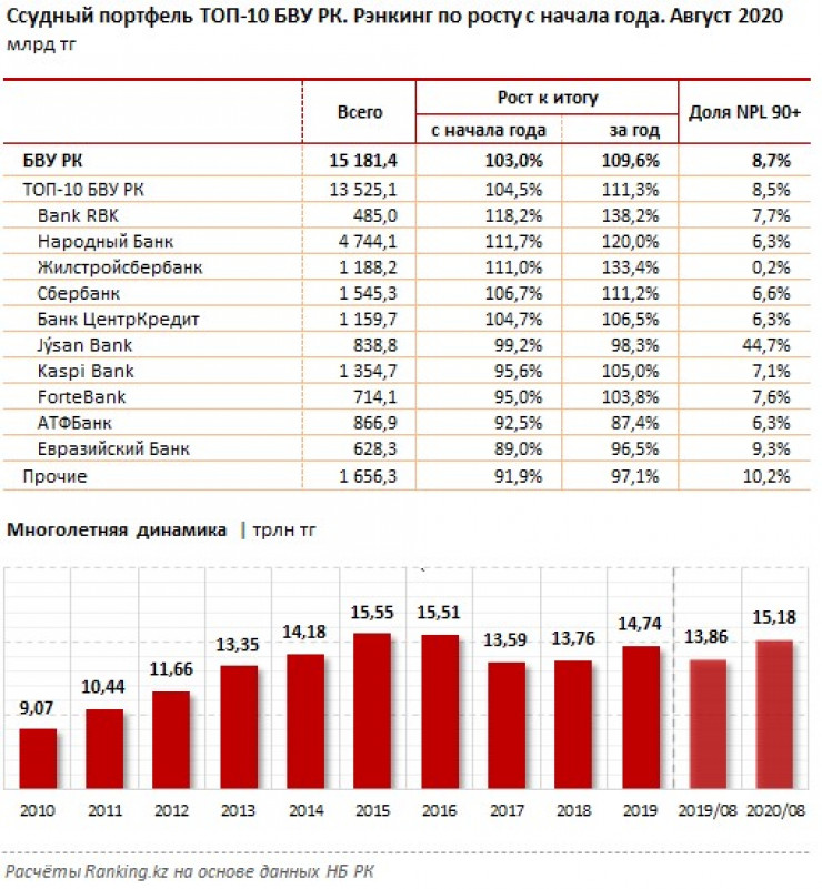 В тройку лидеров по приросту также вошли Народный Банк (плюс 11,7 процента с начала года, до 4,74 триллиона тенге) и государственный Жилстройсбербанк (плюс 11 процентов, до 1,19 триллиона тенге). В годовом разрезе оба банка также в плюсе.