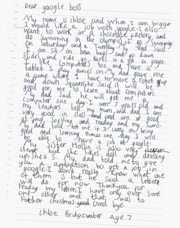 Семилетняя девочка из английского города Херефорд Хлоя Бриджуотер написала письмо в американскую корпорацию Google, в котором попросила взять ее на работу. Текст письма изданию Business Insider показал ее отец Энди.