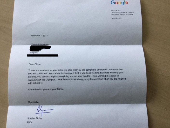 "Дорогая Хлоя. Большое спасибо за письмо. Очень рад, что тебе нравятся компьютеры и роботы. Надеюсь, ты продолжишь интересоваться технологиями. Я думаю, что если ты будешь усердно заниматься и следовать своей мечте, то тебе покорится все, что ты хочешь - от работы в Google до участия в Олимпийских играх. Надеюсь получить твое заявление о приеме на работу после того, как ты закончишь школу", - написал он.