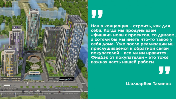 "Корпорация работает стабильно даже в нынешнее сложное для экономики время. У нас нет отставания по срокам, и мы строим планы на будущее. Мы лишь набираем темпы, и часть наших планов – реализация новых проектов в Алматы и Шымкенте", – отмечает Шалкарбек Талипов.