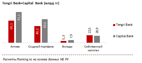 Capital Bank и Tengri Bank по объемам портфелей активов расположены на 24-м и 26-м местах соответственно. Портфель Capital Bank на конец февраля оценивается в 91,1 миллиарда тенге, доля от БВУ РК - 0,4 процента, у Tengri Bank - 65,1 миллиарда тенге и доля - 0,3 процента. После объединения Capital+Tengri по объему активов войдет в ТОП-20 БВУ, доля на рынке составит 0,6 процента, а общий объем активов достигнет 156,3 миллиарда тенге. Доля ссудного портфеля потенциально может увеличиться до 0,8 процента от БВУ РК, а портфель вкладов - до 0,5 процента.