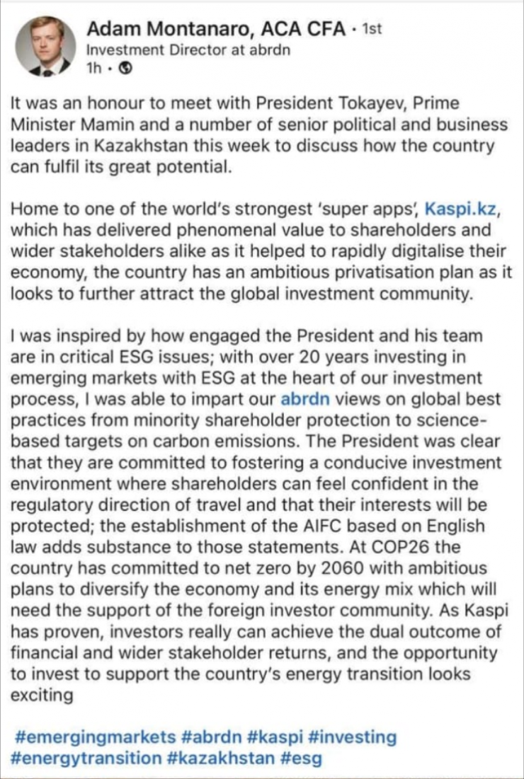 "Для меня было большой честью встретиться с Президентом Токаевым и обсудить огромный потенциал страны, - написал после встречи инвестиционный директор компании Aberdeen Asset Management Адам Монтанаро на своей странице в социальной сети. - Kaзахстан - родина Kaspi.kz, одного из сильнейших в мире суперприложений, которое принесло феноменальную ценность инвесторам и стране, помогая диджитализации экономики".