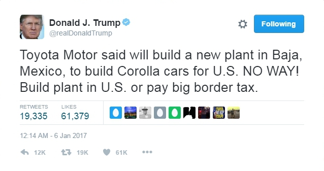 Акции японского автомобильного гиганта Toyota резко упали в цене после твита избранного президента США Дональда Трампа. В четверг, 5 января, республиканец на своей странице в Twitter предостерег компанию от строительства завода в Мексике.