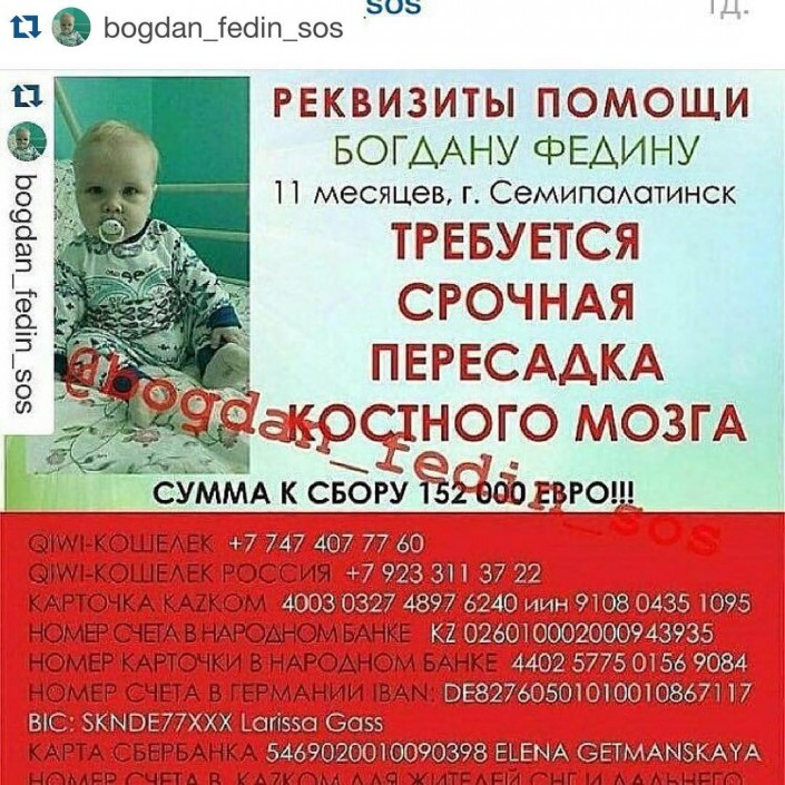 По словам родителей малыша, ему отказали в лечении в Казахстане и России. В Германии же выставили счет на 350 тысяч евро. "У нас нет времени. К Богдану липнет любая инфекция", - пишут родители.