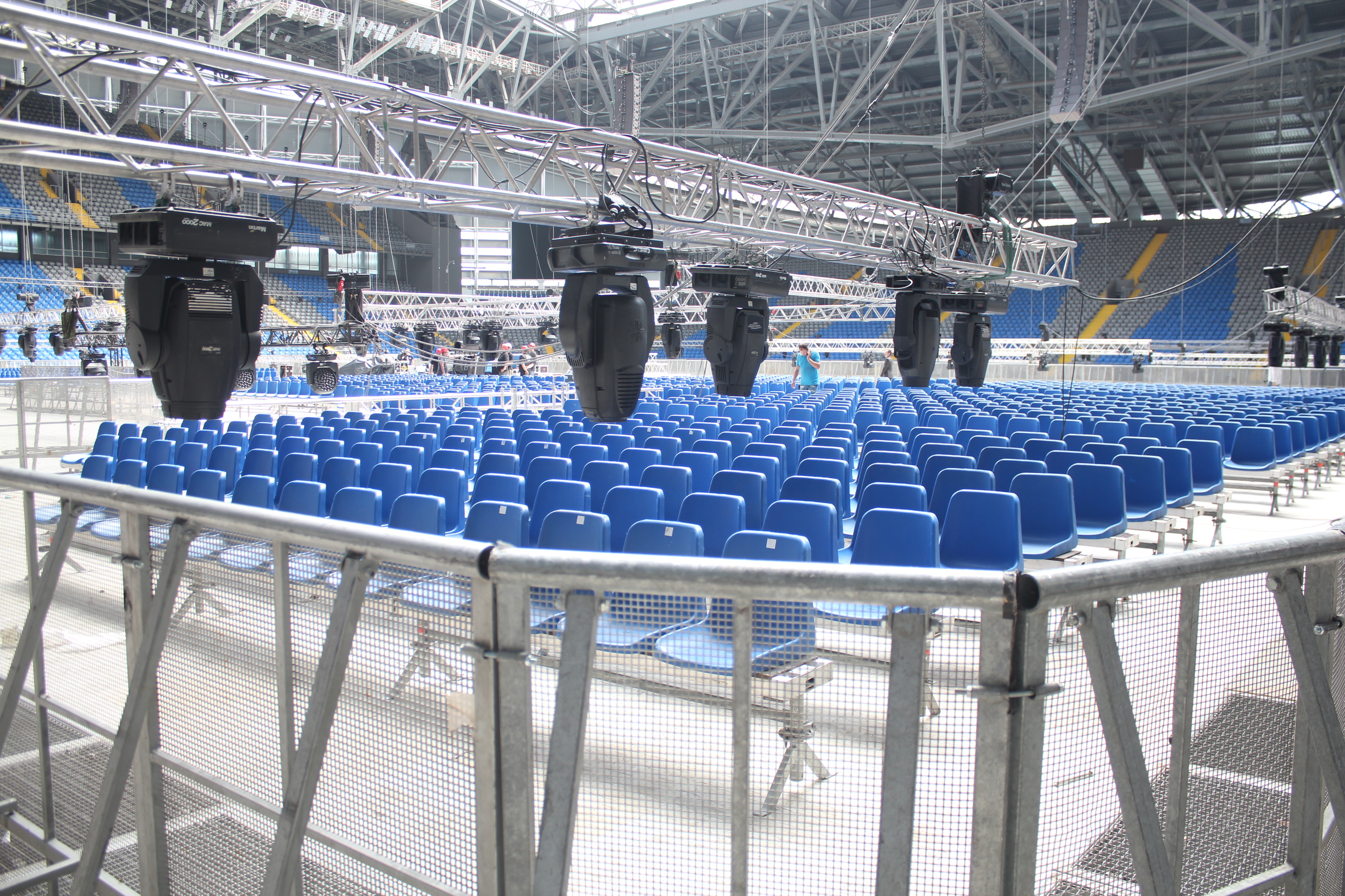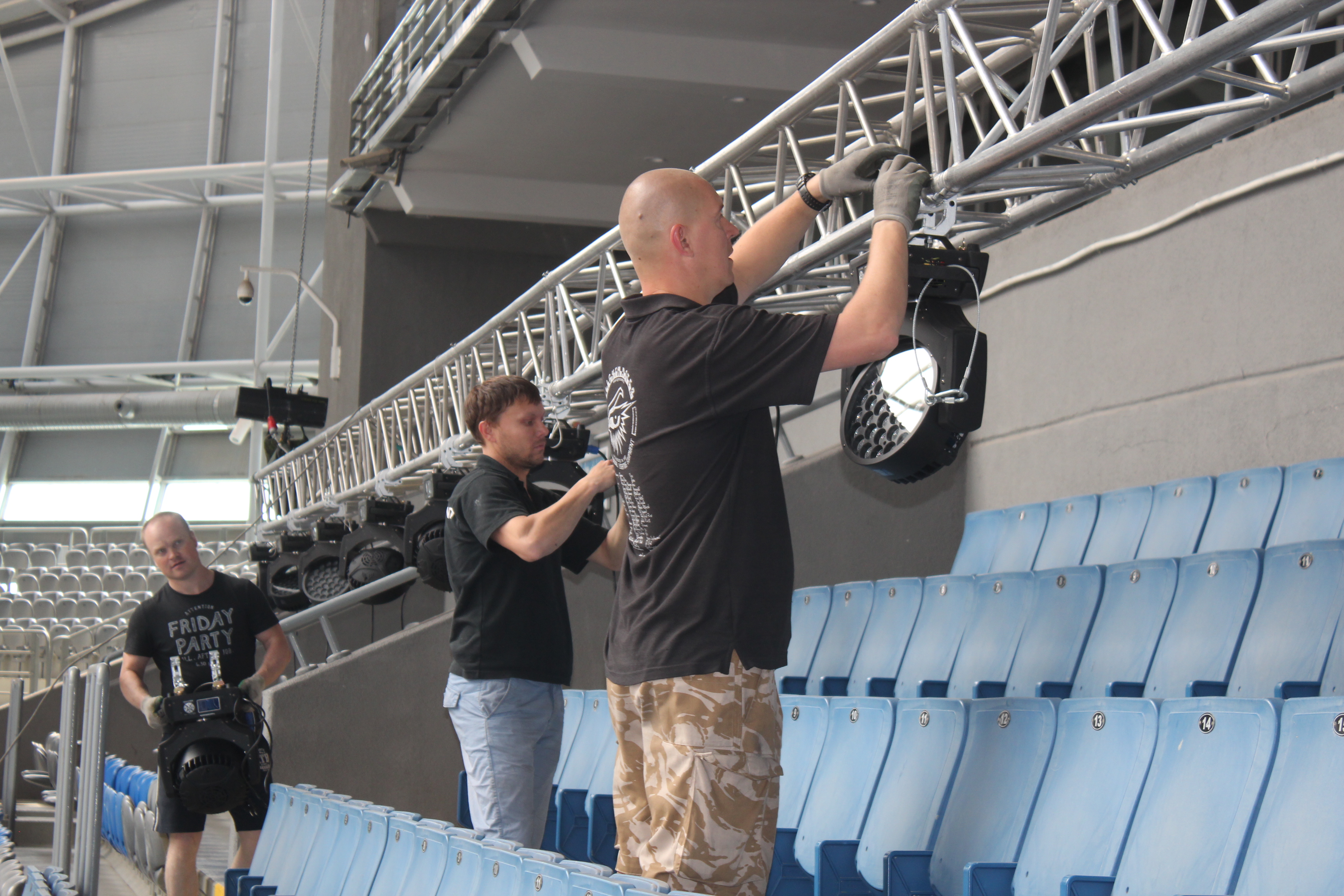 Группа специалистов устанавливает световые приборы. Таких по всему залу будет развешано до 600 штук. На стадионе установят три больших экрана, еще несколько мониторов повесят у трибун.