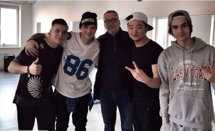 Участники бойз-бэнда MBAND (Артем Пиндюра, Владислав Рамм, Анатолий Цой и Никита Киоссе) и их продюсер Константин Меладзе. © vk.com
