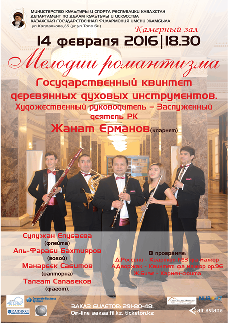 В этот вечер выступит государственный квинтет деревянных духовых инструментов. Художественный руководитель - заслуженный деятель РК Жанат Ерманов. В составе квинтета играют Сулужан Елубаева (флейта), Аль-Фараби Бахтияров (габон), Манарбек Сабитов (валторна), Талгат Сапабеков (фагот).