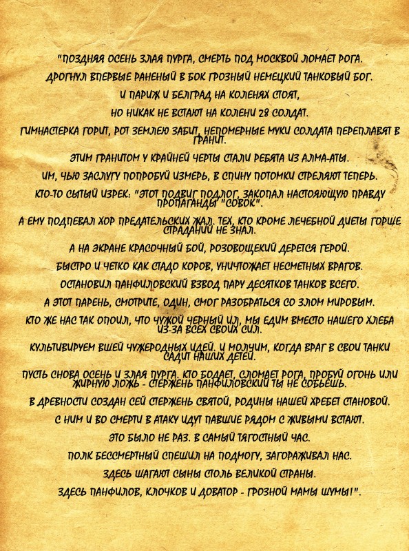 "Однозначно подвиг 28 панфиловцев был. А кто иначе остановил танки под Москвой именно на том участке Волоколамского шоссе у разъезда Дубосекова? Если бы это был единичный случай такого сверхъестественного героизма с точки зрения нынешних обывателей, я бы, может, засомневался. Но в Великую Отечественную войну люди нередко проявляли героизм небывалый", - сказал он.