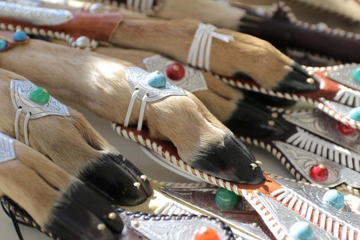 Камчи из копыт косули и рогов горного козла, настоящие украшенные щиты из кожи и металла, подвески и браслеты из камней, кораллов и самоцветов. Все изготовлено вручную с использованием только натуральных материалов по технологиям тюркоязычных кочевых народов.